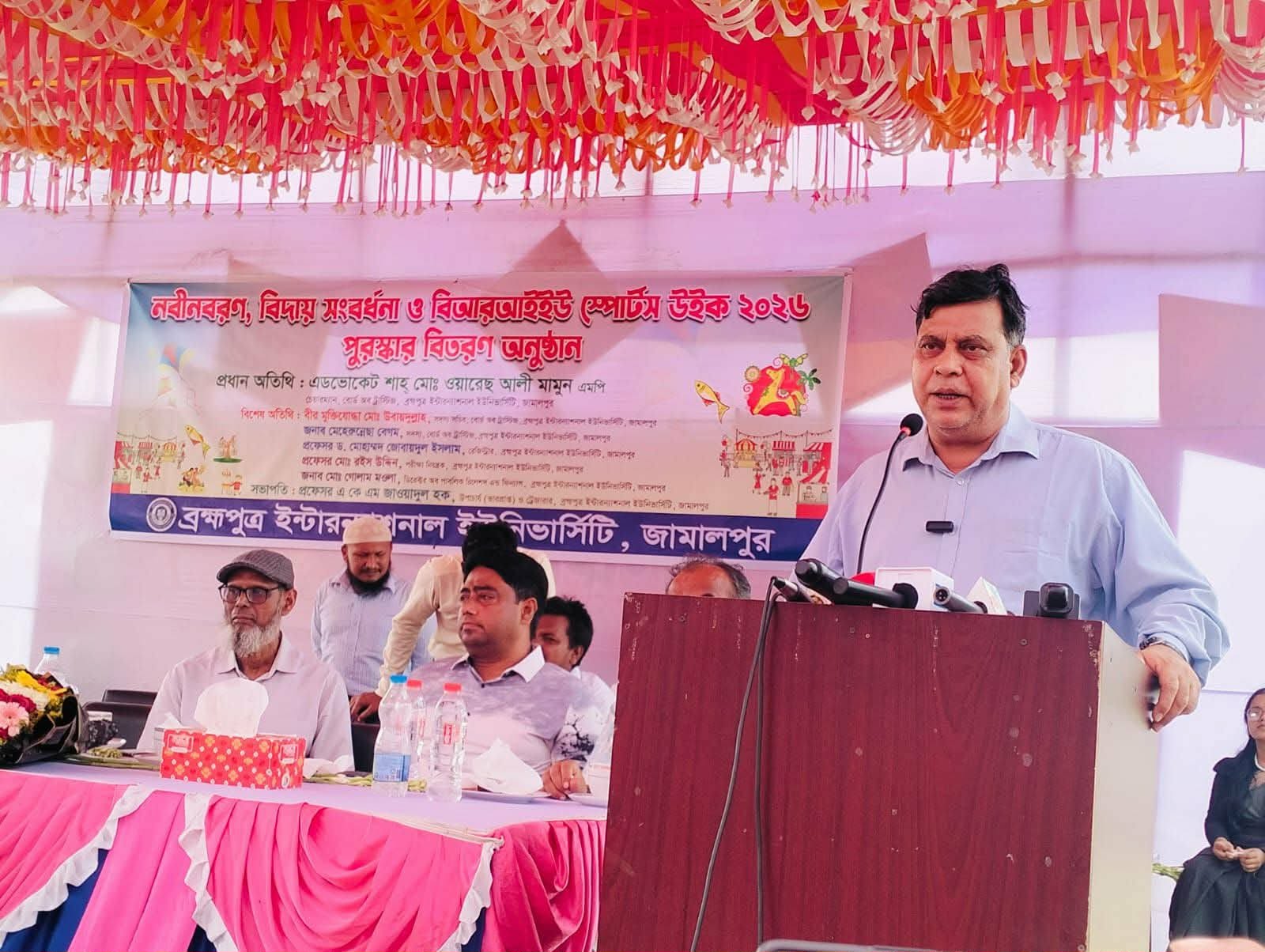জামালপুরে ব্রহ্মপুত্র ইন্টারন্যাশনাল ইউনিভার্সিটির নবীন বরণ, বিদায় সংবর্ধনা এবং সপ্তাহব্যাপী আয়োজিত বার্ষিক ক্রীড়া প্রতিযোগিতার পুরস্কার বিতরণী অনুষ্ঠানে প্রধান অতিথির বক্তব্য রাখেন বিশ্ববিদ্যালয় ট্রাস্টি বোর্ডের চেয়ারম্যান ও জামালপুর সদর আসনের সংসদ সদস্য এডভোকেট শাহ মোঃ ওয়ারেছ আলী মামুন।